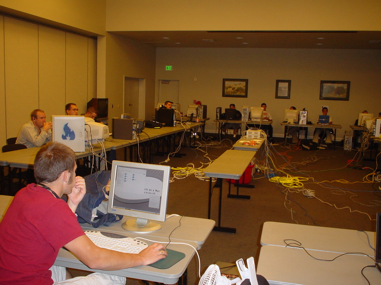 The staff did a good job of preparing for this, by printing out nice instruction sheets on how to use virtual drive software, and mount images and the like. They also were kept busy troubleshooting various problems with getting CS to work on some of the jerry computer systems that people brought. Speaking of Jerry computer setups, there were quite a few, including serveral HPs and Compaqs that were barely powerful enough to run CS ... which explains why CS was so popular.