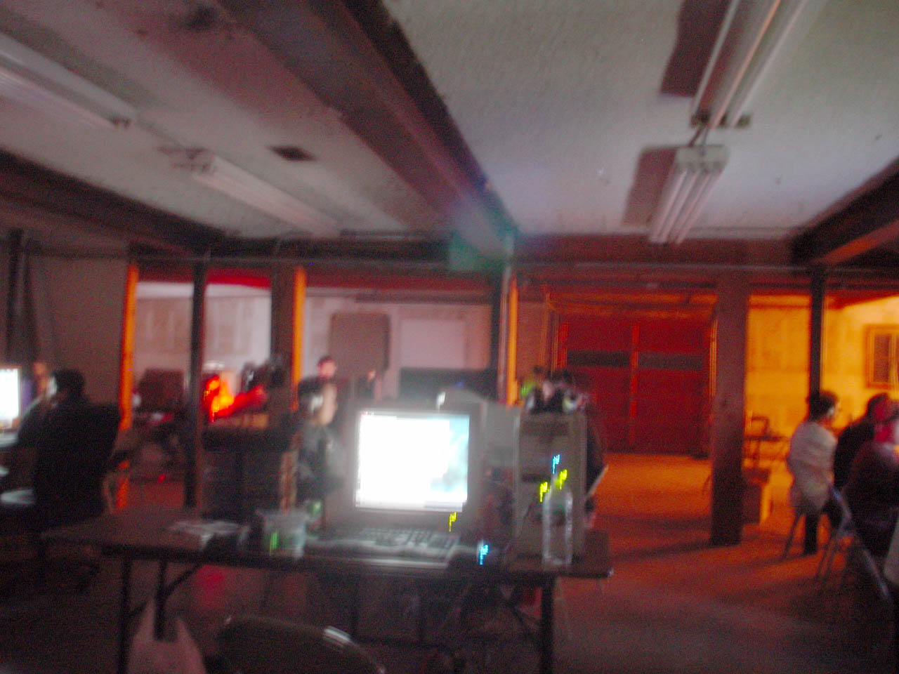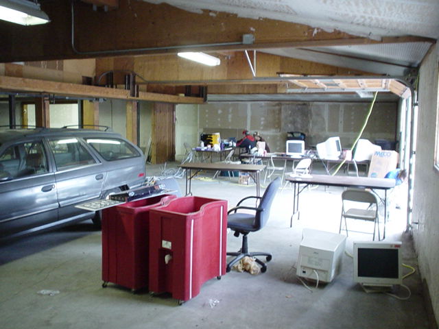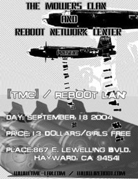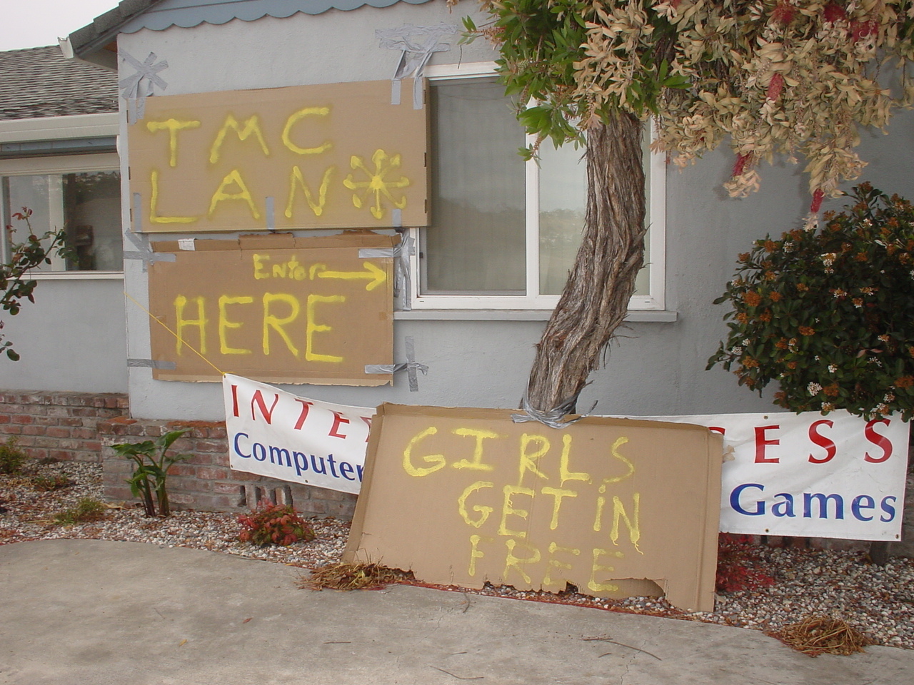 In September 2004, Demise was working for a LAN center in Hayward called Reboot. Demise approached me with an opportunity for TMC to co-host a LAN event with Reboot. It turns out the guy that owned the Reboot center (his name was Mel), had access to another space in Hayward. This new space turned out to be very strange, it was a duplex house with Mel living on one side and his landlords living on the other. Attached to the back of the duplex was some sort of industrial workshop space; I was told it used to be a print shop. The whole place felt like a large garage or warehouse. There was also an upstairs loft area with a few strangely shaped rooms.